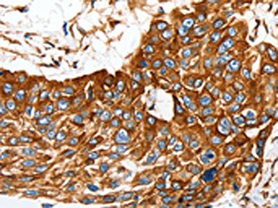 The image on the left is immunohistochemistry of paraffin-embedded Human esophagus cancer tissue using CSB-PA783399(MCAM Antibody) at dilution 1/100, on the right is treated with synthetic peptide. (Original magnification: ×200)