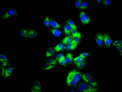• Immunofluorescence staining of Hela cells with CSB-PA013585LA01HU at 1:66, counter-stained with DAPI. The cells were fixed in 4% formaldehyde, permeabilized using 0.2% Triton X-100 and blocked in 10% normal Goat Serum. The cells were then incubated with the antibody overnight at 4°C. The secondary antibody was Alexa Fluor 488-congugated AffiniPure Goat Anti-Rabbit IgG(H+L).