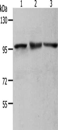 Gel: 8%SDS-PAGE, Lysate: 50 μg, Lane 1-3: NIH/3T3 cells, Hela cells, K562 cells, Primary antibody: CSB-PA232265(MCM4 Antibody) at dilution 1/700, Secondary antibody: Goat anti rabbit IgG at 1/8000 dilution, Exposure time: 10 seconds