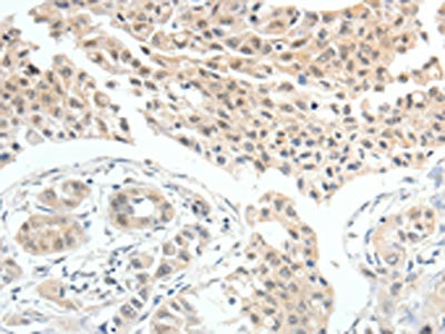 The image on the left is immunohistochemistry of paraffin-embedded Human lung cancer tissue using CSB-PA152593(MDK Antibody) at dilution 1/60, on the right is treated with fusion protein. (Original magnification: ×200)