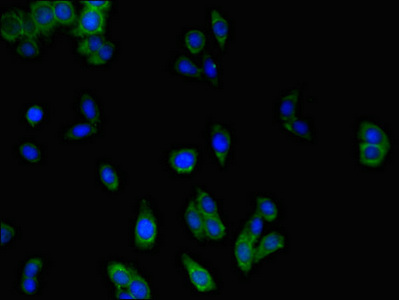 • Immunofluorescent analysis of HepG2 cells using CSB-PA613581LA01HU at dilution of 1:100 and Alexa Fluor 488-congugated AffiniPure Goat Anti-Rabbit IgG(H+L)