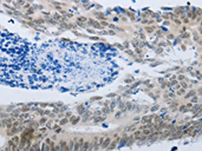 • The image on the left is immunohistochemistry of paraffin-embedded Human colon cancer tissue using CSB-PA729577(MMP21 Antibody) at dilution 1/45, on the right is treated with synthetic peptide. (Original magnification: ×200)