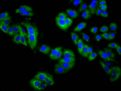 Immunofluorescence staining of HepG2 cells with CSB-PA615679LA01HU at 1:200, counter-stained with DAPI. The cells were fixed in 4% formaldehyde, permeabilized using 0.2% Triton X-100 and blocked in 10% normal Goat Serum. The cells were then incubated with the antibody overnight at 4°C. The secondary antibody was Alexa Fluor 488-congugated AffiniPure Goat Anti-Rabbit IgG(H+L).