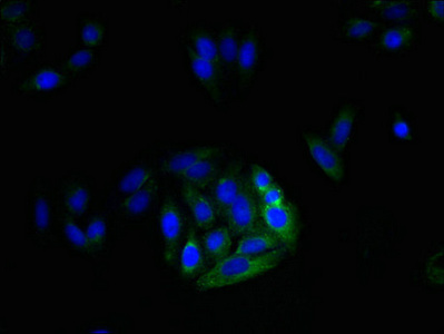 • Immunofluorescent analysis of HepG2 cells using CSB-PA850382LA01HU at dilution of 1:100 and Alexa Fluor 488-congugated AffiniPure Goat Anti-Rabbit IgG(H+L)