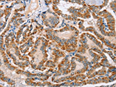 The image on the left is immunohistochemistry of paraffin-embedded Human thyroid cancer tissue using CSB-PA301850(MSMB Antibody) at dilution 1/30, on the right is treated with fusion protein. (Original magnification: ×200)
