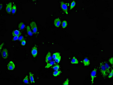 Immunofluorescent analysis of HepG2 cells using CSB-PA015190LA01HU at dilution of 1:100 and Alexa Fluor 488-congugated AffiniPure Goat Anti-Rabbit IgG(H+L)