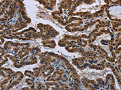 • The image on the left is immunohistochemistry of paraffin-embedded Human thyroid cancer tissue using CSB-PA965036(MYCN Antibody) at dilution 1/50, on the right is treated with synthetic peptide. (Original magnification: ×200)