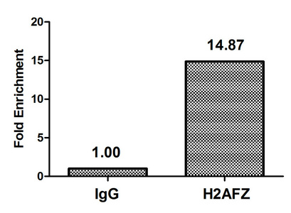 Chromatin Immunoprecipitation Hela (4*106) were treated with Micrococcal Nuclease, sonicated, and immunoprecipitated with 5µg anti-H2AFZ (CSB-PA010100OA04me1HU) or a control normal rabbit IgG. The resulting ChIP DNA was quantified using real-time PCR with primers against the β-Globin promoter.