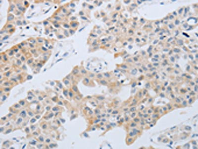 The image on the left is immunohistochemistry of paraffin-embedded Human breast cancer tissue using CSB-PA170330(NBN Antibody) at dilution 1/30, on the right is treated with synthetic peptide. (Original magnification: ×200)