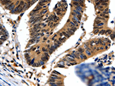 The image on the left is immunohistochemistry of paraffin-embedded Human colon cancer tissue using CSB-PA146631(NEFL Antibody) at dilution 1/20, on the right is treated with fusion protein. (Original magnification: ×200)