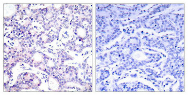 • Immunohistochemical analysis of paraffin-embedded human breast carcinoma tissue using NFkB-p105(Ab-893) Antibody(left) or the same antibody preincubated with blocking peptide(right).