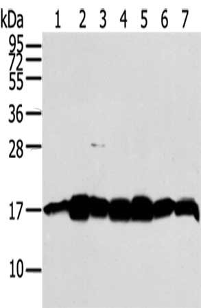 Gel: 12%SDS-PAGE,Lysate: 40 μg,Lane 1-7: Jurkat cells, A549 cells, Mouse brain tissue, 293T cells, LNCap cells, NIH/3T3 cells, Hela cells,Primary antibody: CSB-PA578283(NME2 Antibody) at dilution 1/300 dilution,Secondary antibody: Goat anti rabbit IgG at 1/8000 dilution,Exposure time: 30 seconds