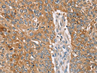 The image on the left is immunohistochemistry of paraffin-embedded Human liver cancer tissue using CSB-PA439984(NOS2 Antibody) at dilution 1/25, on the right is treated with synthetic peptide. (Original magnification: ×200)