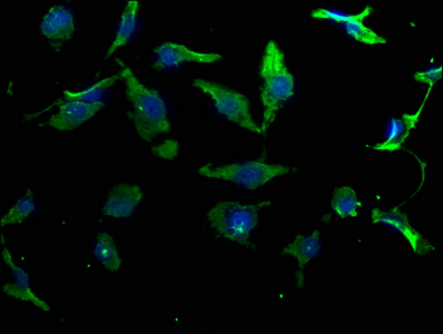• Immunofluorescence staining of U251 cells with CSB-PA015983OA01HU at 1:50, counter-stained with DAPI. The cells were fixed in 4% formaldehyde, permeabilized using 0.2% Triton X-100 and blocked in 10% normal Goat Serum. The cells were then incubated with the antibody overnight at 4°C. The secondary antibody was Alexa Fluor 488-congugated AffiniPure Goat Anti-Rabbit IgG(H+L).