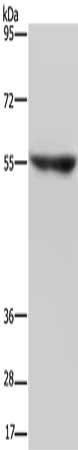 • Gel: 6%SDS-PAGE, Lysate: 40 μg, Lane: Human fetal brain tissue, Primary antibody: CSB-PA576563(NRG3 Antibody) at dilution 1/200, Secondary antibody: Goat anti rabbit IgG at 1/8000 dilution, Exposure time: 2 minutes