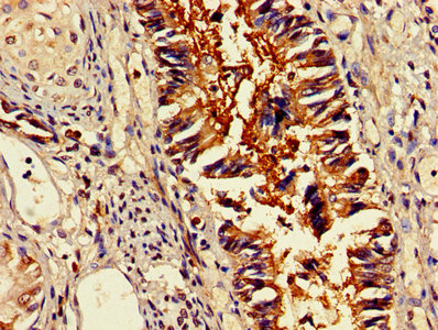 • IHC image of CSB-PA856923LA01HU diluted at 1:400 and staining in paraffin-embedded human lung tissue performed on a Leica BondTM system. After dewaxing and hydration, antigen retrieval was mediated by high pressure in a citrate buffer (pH 6.0). Section was blocked with 10% normal goat serum 30min at RT. Then primary antibody (1% BSA) was incubated at 4°C overnight. The primary is detected by a biotinylated secondary antibody and visualized using an HRP conjugated SP system.