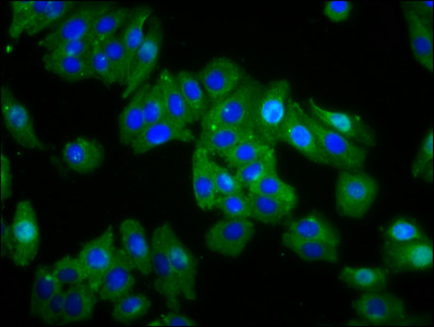 Immunofluorescence staining of HepG2 cells with CSB-PA016352LA01HU at 1:66, counter-stained with DAPI. The cells were fixed in 4% formaldehyde, permeabilized using 0.2% Triton X-100 and blocked in 10% normal Goat Serum. The cells were then incubated with the antibody overnight at 4°C. The secondary antibody was Alexa Fluor 488-congugated AffiniPure Goat Anti-Rabbit IgG(H+L).