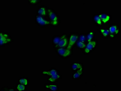 • Immunofluorescence staining of HepG2 cells with CSB-PA016359OA01HU at 1:50, counter-stained with DAPI. The cells were fixed in 4% formaldehyde, permeabilized using 0.2% Triton X-100 and blocked in 10% normal Goat Serum. The cells were then incubated with the antibody overnight at 4°C. The secondary antibody was Alexa Fluor 488-congugated AffiniPure Goat Anti-Rabbit IgG(H+L).
