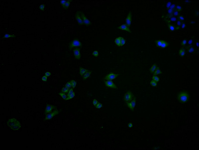 Immunofluorescence staining of Hela cells with CSB-PA873623OA01HU at 1:100, counter-stained with DAPI. The cells were fixed in 4% formaldehyde and blocked in 10% normal Goat Serum. The cells were then incubated with the antibody overnight at 4°C. The secondary antibody was Alexa Fluor 488-congugated AffiniPure Goat Anti-Rabbit IgG(H+L).