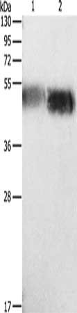 • Gel: 12%SDS-PAGE, Lysate: 40 μg, Lane 1-2: Human testis tissue, Human prostate tissue, Primary antibody: CSB-PA906899(ORM1 Antibody) at dilution 1/133, Secondary antibody: Goat anti rabbit IgG at 1/8000 dilution, Exposure time: 2 minutes