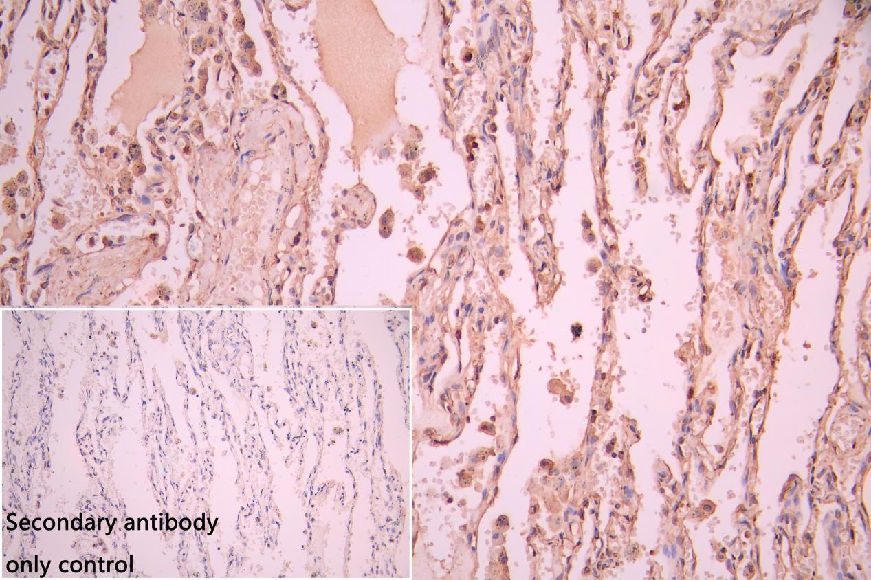 IHC image of CSB-PA613402LA01HU diluted at 1:50 and staining in paraffin-embedded human Lung cancer performed on a Leica BondTM system. After dewaxing and hydration, antigen retrieval was mediated by high pressure in a citrate buffer (pH 6.0). Section was blocked with 10% normal goat serum 30min at RT. Then primary antibody (1% BSA) was incubated at 4°C overnight. The primary is detected by a Goat anti-rabbit polymer IgG labeled by HRP and visualized using 0.05% DAB. Secondary antibody only control: uses 1% BSA instead of primary antibody