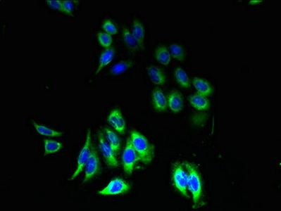 • Immunofluorescent analysis of HepG2 cells using CSB-PA860651LA01HU at dilution of 1:100 and Alexa Fluor 488-congugated AffiniPure Goat Anti-Rabbit IgG(H+L)