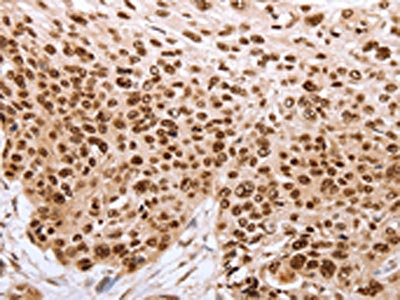 • The image on the left is immunohistochemistry of paraffin-embedded Human esophagus cancer tissue using CSB-PA436053(PARP1 Antibody) at dilution 1/40, on the right is treated with synthetic peptide. (Original magnification: ×200)
