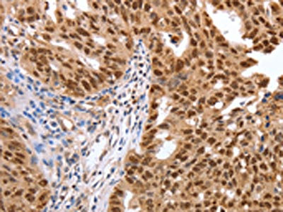 • The image on the left is immunohistochemistry of paraffin-embedded Human ovarian cancer tissue using CSB-PA436053(PARP1 Antibody) at dilution 1/40, on the right is treated with synthetic peptide. (Original magnification: ×200)