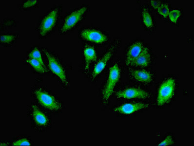 • Immunofluorescent analysis of Hela cells using CSB-PA017796LA01HU at dilution of 1:100 and Alexa Fluor 488-congugated AffiniPure Goat Anti-Rabbit IgG(H+L)