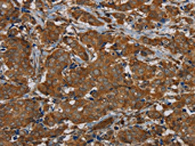 The image on the left is immunohistochemistry of paraffin-embedded Human breast cancer tissue using CSB-PA597940(PIK3CD Antibody) at dilution 1/20, on the right is treated with synthetic peptide. (Original magnification: ×200)