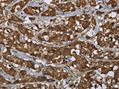 • The image on the left is immunohistochemistry of paraffin-embedded Human breast cancer tissue using CSB-PA697513(PIP Antibody) at dilution 1/50, on the right is treated with fusion protein. (Original magnification: ×200)