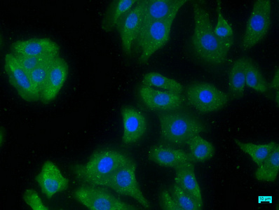 • Immunofluorescence staining of HepG2 cells with CSB-PA666060LA01HU at 1:50, counter-stained with DAPI. The cells were fixed in 4% formaldehyde, permeabilized using 0.2% Triton X-100 and blocked in 10% normal Goat Serum. The cells were then incubated with the antibody overnight at 4°C. The secondary antibody was Alexa Fluor 488-congugated AffiniPure Goat Anti-Rabbit IgG(H+L).