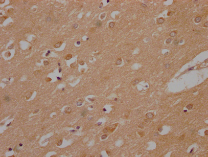 IHC image of CSB-PA823450PA01HU diluted at 1:200 and staining in paraffin-embedded human brain tissue performed on a Leica BondTM system. After dewaxing and hydration, antigen retrieval was mediated by high pressure in a citrate buffer (pH 6.0). Section was blocked with 10% normal goat serum 30min at RT. Then primary antibody (1% BSA) was incubated at 4°C overnight. The primary is detected by a Goat anti-rabbit polymer IgG labeled by HRP and visualized using 0.05% DAB.