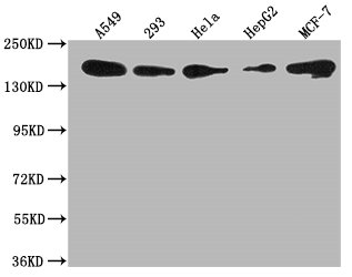 Positive WB detected in: A549 whole cell lysate, 293 whole cell lysate, Hela whole cell lysate, HepG2 whole cell lysate, MCF-7 whole cell lysate