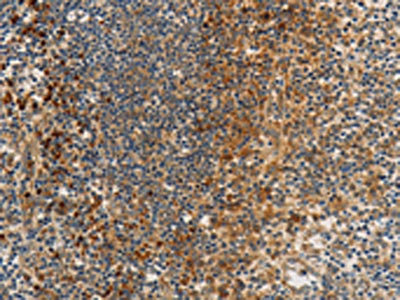 The image on the left is immunohistochemistry of paraffin-embedded Human tonsil tissue using CSB-PA234947(PPP2CB Antibody) at dilution 1/80, on the right is treated with synthetic peptide. (Original magnification: ×200)