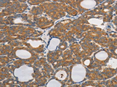 The image on the left is immunohistochemistry of paraffin-embedded Human thyroid cancer tissue using CSB-PA234947(PPP2CB Antibody) at dilution 1/80, on the right is treated with synthetic peptide. (Original magnification: ×200)