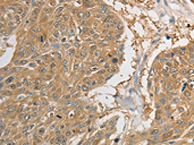 The image on the left is immunohistochemistry of paraffin-embedded Human ovarian cancer tissue using CSB-PA780249(PRDX1 Antibody) at dilution 1/20, on the right is treated with synthetic peptide. (Original magnification: ×200)