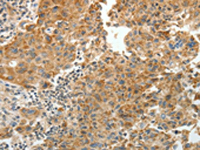 The image on the left is immunohistochemistry of paraffin-embedded Human lung cancer tissue using CSB-PA566617(PRKCA Antibody) at dilution 1/10, on the right is treated with fusion protein. (Original magnification: ×200)