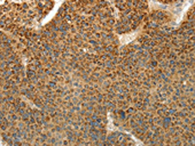 The image on the left is immunohistochemistry of paraffin-embedded Human liver cancer tissue using CSB-PA566617(PRKCA Antibody) at dilution 1/10, on the right is treated with fusion protein. (Original magnification: ×200)
