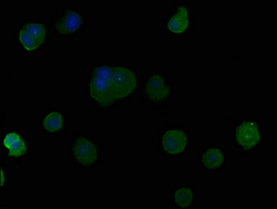 Immunofluorescence staining of MCF-7 cells with CSB-PA27499A0Rb at 1:50, counter-stained with DAPI. The cells were fixed in 4% formaldehyde, permeabilized using 0.2% Triton X-100 and blocked in 10% normal Goat Serum. The cells were then incubated with the antibody overnight at 4°C. The secondary antibody was Alexa Fluor 488-congugated AffiniPure Goat Anti-Rabbit IgG(H+L).