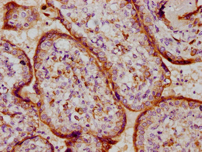 IHC image of CSB-PA27499A0Rb diluted at 1:100 and staining in paraffin-embedded human placenta tissue performed on a Leica BondTM system. After dewaxing and hydration, antigen retrieval was mediated by high pressure in a citrate buffer (pH 6.0). Section was blocked with 10% normal goat serum 30min at RT. Then primary antibody (1% BSA) was incubated at 4°C overnight. The primary is detected by a biotinylated secondary antibody and visualized using an HRP conjugated SP system.