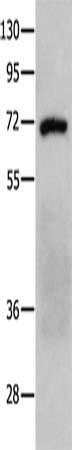 • Gel: 10%SDS-PAGE, Lysate: 40 μg, Lane: NIH/3T3 cells, Primary antibody: CSB-PA206620(PTPN11 Antibody) at dilution 1/300, Secondary antibody: Goat anti rabbit IgG at 1/8000 dilution, Exposure time: 1 minute