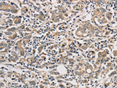 • The image on the left is immunohistochemistry of paraffin-embedded Human gastric cancer tissue using CSB-PA223710(PTPN11 Antibody) at dilution 1/25, on the right is treated with fusion protein. (Original magnification: ×200)
