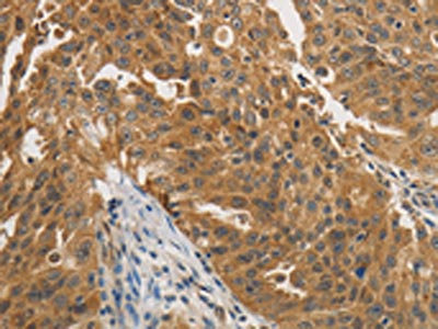 • The image on the left is immunohistochemistry of paraffin-embedded Human ovarian cancer tissue using CSB-PA223710(PTPN11 Antibody) at dilution 1/25, on the right is treated with fusion protein. (Original magnification: ×200)