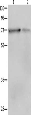 • Gel: 10%SDS-PAGE, Lysate: 40 μg, Lane 1-2: NIH/3T3 cells, hela cells, Primary antibody: CSB-PA223710(PTPN11 Antibody) at dilution 1/400, Secondary antibody: Goat anti rabbit IgG at 1/8000 dilution, Exposure time: 1 minute