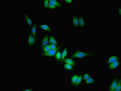 Immunofluorescent analysis of HepG2 cells using CSB-PA019068YA01HU at dilution of 1:100 and Alexa Fluor 488-congugated AffiniPure Goat Anti-Rabbit IgG(H+L)