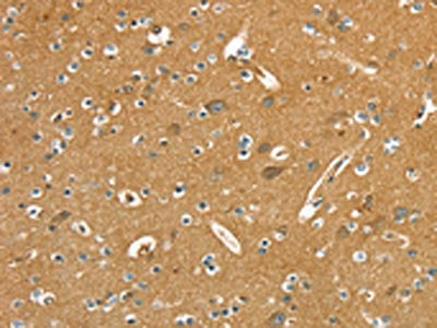 The image on the left is immunohistochemistry of paraffin-embedded Human brain tissue using CSB-PA185772(PYGL Antibody) at dilution 1/20, on the right is treated with fusion protein. (Original magnification: ×200)