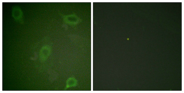 Immunofluorescence staining of methanol-fixed HeLa cells using Amyloid β A4 (phospho-Thr743/668) Antibody.