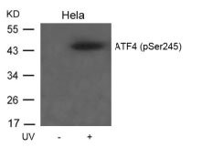 Western blot analysis of extracts from Hela cells untreated or treated with UV using ATF4(Phospho-Ser245) Antibody.