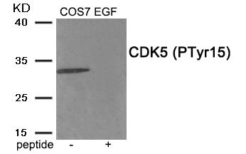 • Western blot analysis of extracts from COS7 cells treated with EGF using Phospho-CDK5 (Tyr15) antibody.The lane on the right is treated with the antigen-specific peptide.